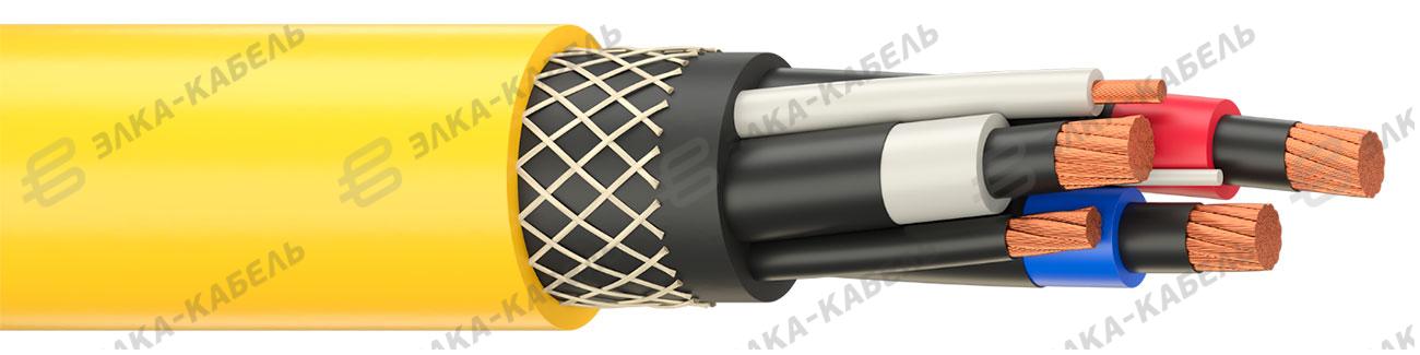 Кабель (К) силовой гибкий (Г) с медными жилами, с теплостойкой изоляцией из этиленпропиленового эластомера (Т), с электропроводящими экранами (Э), в оболочке из маслобензостойкого, износостойкого термопластичного эластомера на основе ПВХ-пластиката, не распространяющего горение при одиночной прокладке (Н), с интегрированнай оплеткой из полиэфирных нитей в оболочке.