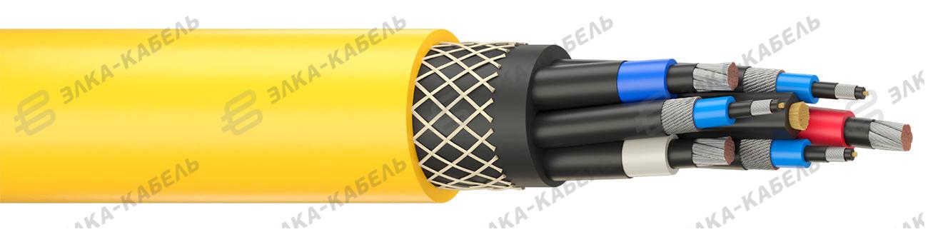 Специализированный барабанный кабель для подземных самоходных вагонов с изоляцией из этиленпропиленовой резины, с электропроводящими экранами, с распределенными в виде концентрических повивов вспомогательными жилами и жилой заземления, сердечником на основе арамидных нитей, армирующей оплеткой, оболочками из термоэластичного эластомера.