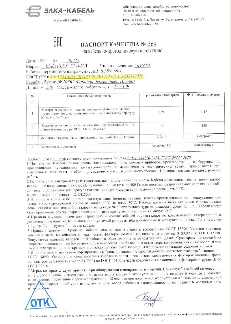 Рис. 1 Паспорт качества на кабель ELKAFLEX КГН-ХЛ 4х16 0,38/066-1