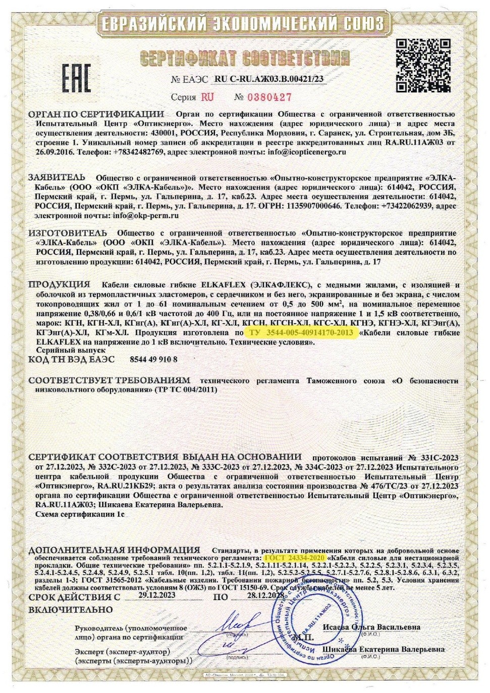 2. Запросить у производителя сертификат соответствия требованиям технического регламента Таможенного Союза ТР ТС 004/2011. Для большинства кабельных изделий этот документ является обязательным. Он отражает соответствие продукции установленным требованиям надежности и безопасности. Этот документ в обязательном порядке содержит информацию о стандартах, по которым изготовлен кабель. Пример такого сертификата для гибких кабелей ELKAFLEX приведен на рисунке ниже. В основном разделе можно найти номер ТУ 3544-005-40914170-2013, а в разделе дополнительной информации указан ГОСТ 24334-2020.