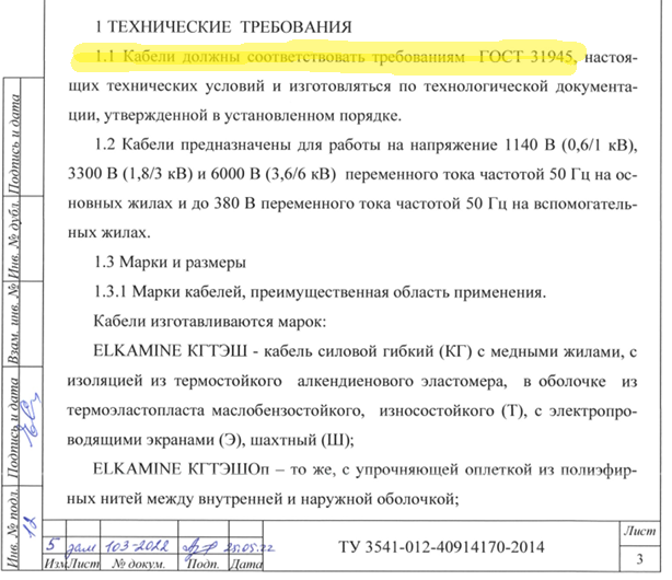 Пункт 1.1. указывает на то, что продукция должна соответствовать требованиям ГОСТ 31945 КАБЕЛИ ГИБКИЕ И ШНУРЫ ДЛЯ ПОДЗЕМНЫХ И ОТКРЫТЫХ ГОРНЫХ РАБОТ. Общие технические условия.