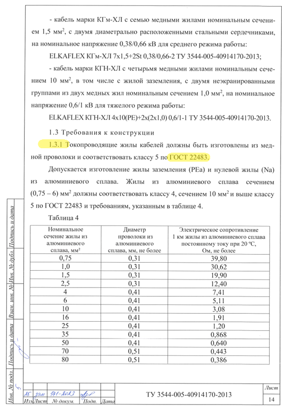 Пункт.1.3.1 ТУ требует соответствия токопроводящих жил требованиям ГОСТ 22483-2021 Жилы токопроводящие для кабелей, проводов и шнуров.